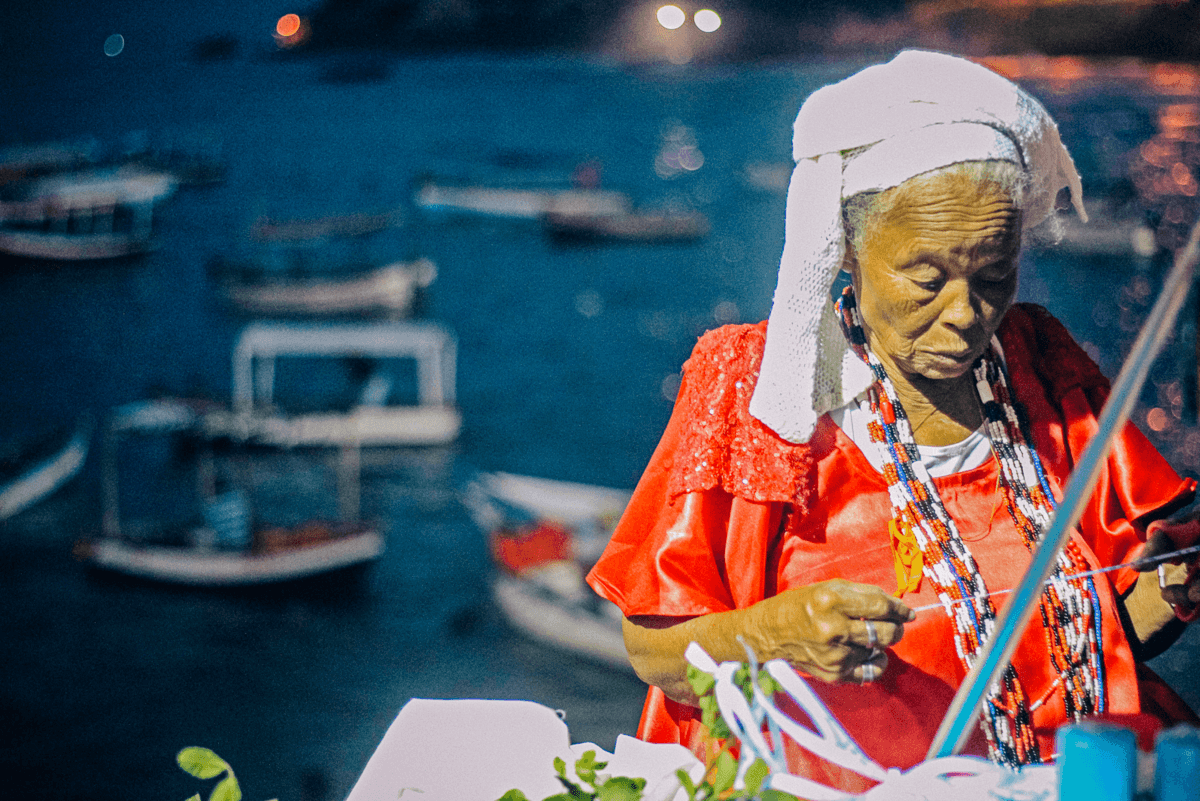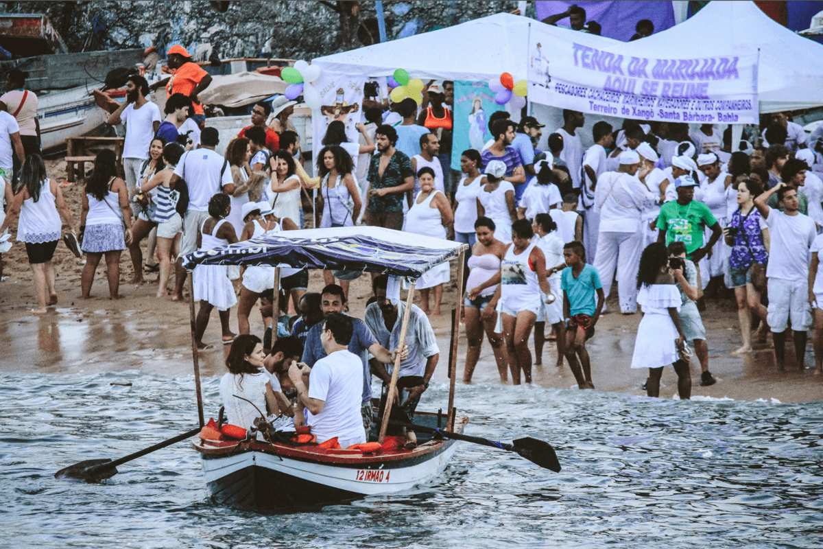 Ao chegar na praia do Rio Vermelho, já avistei muitos terreiros com suas tendas montadas e os rituais de fé acontecendo concomitantemente em meio à uma fila enorme de fiéis com suas oferendas nas mãos. O local todo exalava alfazema. Desde as águas que continham muitos barcos saindo com turistas e pessoas locais que faziam questão de entregar a oferenda em alto mar, até a areia da praia que quase não sobrava espaço de tanta gente.
