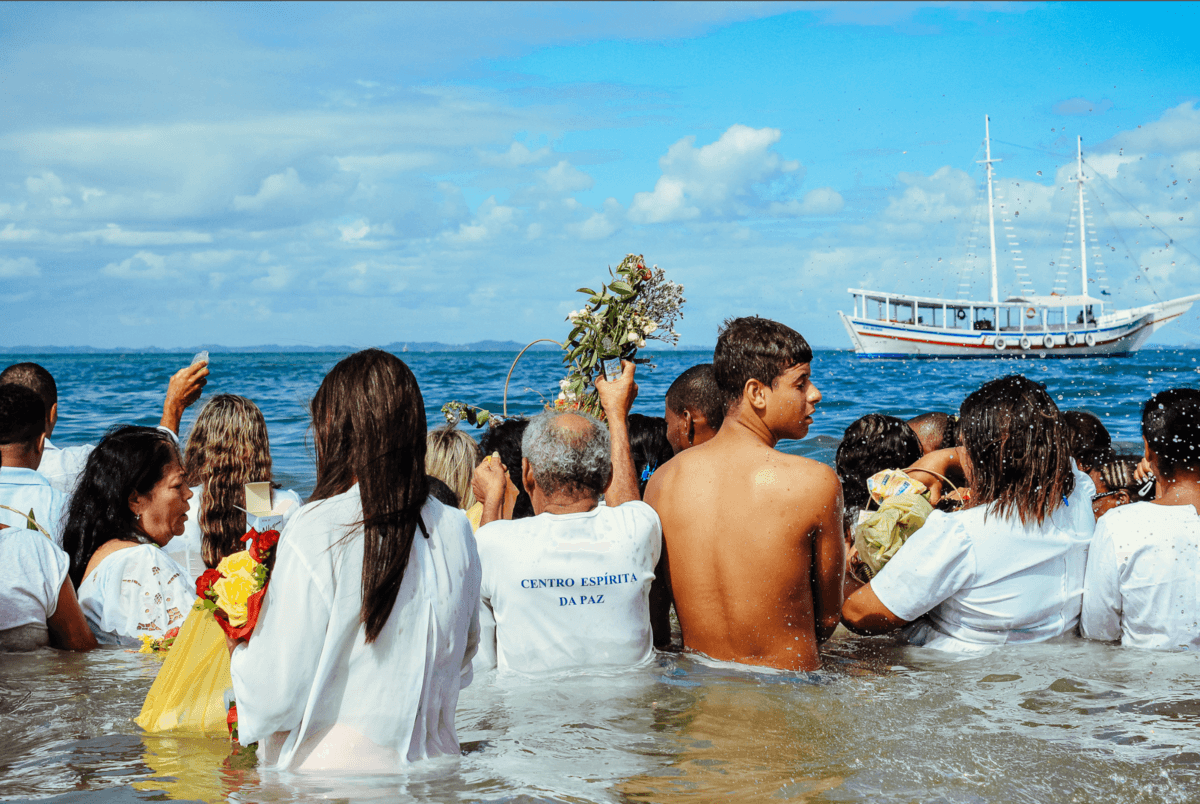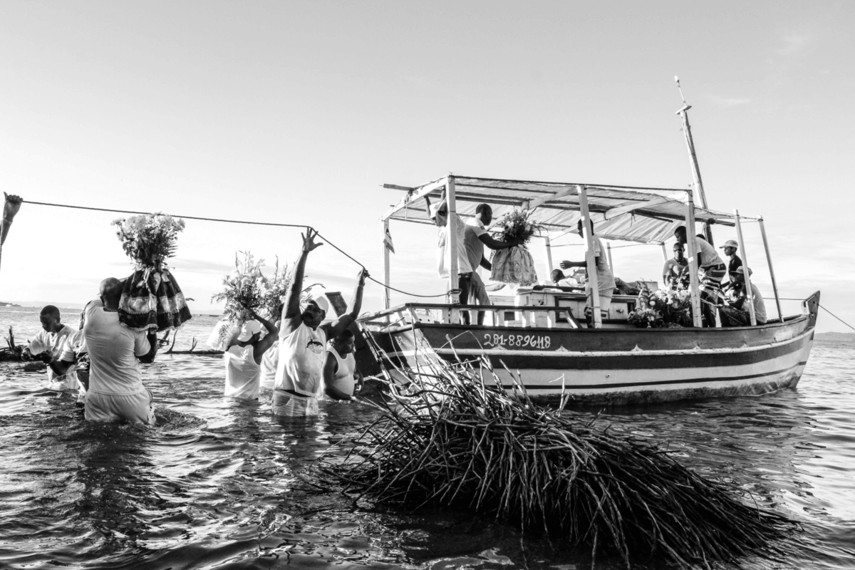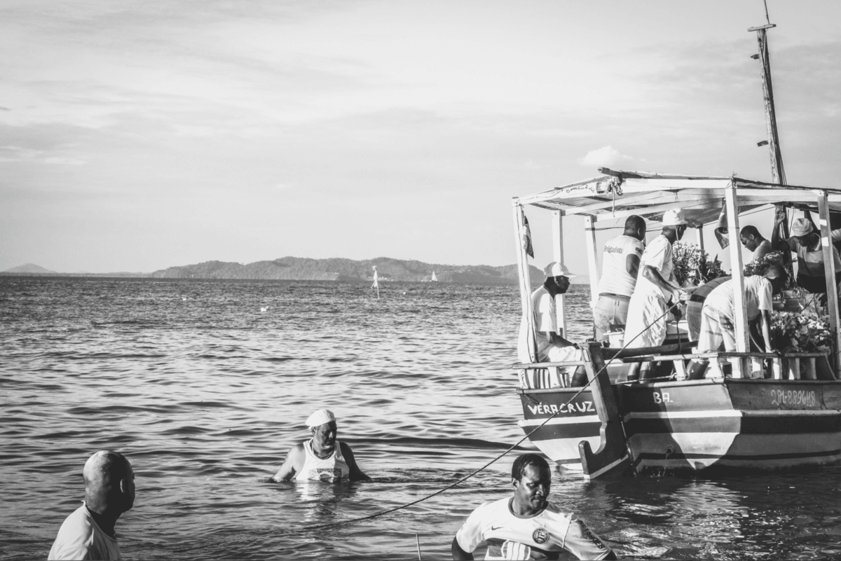 Ao sair dali, já pela manhã, peguei um barco e fui para a Ilha de Itaparica. Lá outras celebrações acontecem. Vários centros espíritas e terreiros levam suas oferendas à Iemanjá, em uma menor proporção se comparado ao Rio Vermelho, porém, não menos fiel. Acompanhei pessoas recebendo entidades, como já tinha presenciado pouco antes em Salvador, ao levar suas oferendas ao mar. Vi também barcos sendo carregados com cestas de flores que seriam levadas em alto mar. Era uma movimentação de idosos, jovens e crianças. Todos em prol da mesma crença.